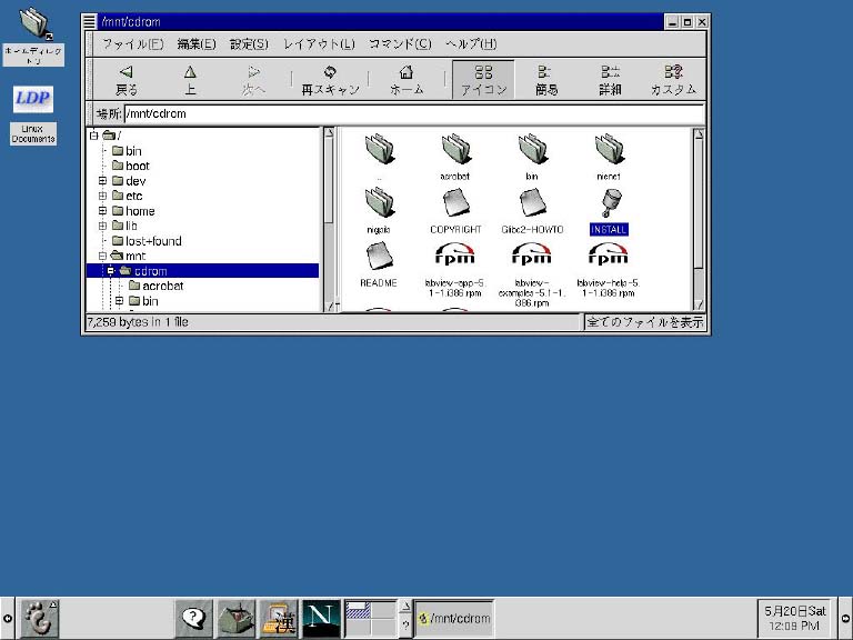 Red Hat Linux6.1をセットしたマシンにLabVIEW for LinuxのCD-ROMをセットすると、ファイルマネージャーに、CD-ROMの内容が表示される。(図1)